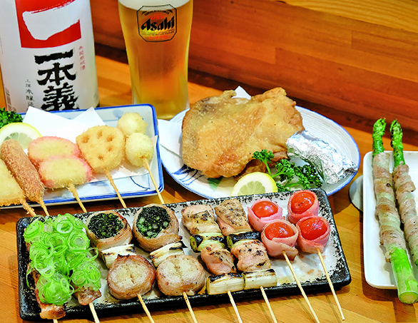 炭火で焼き上げる串料理と串揚げが名物。